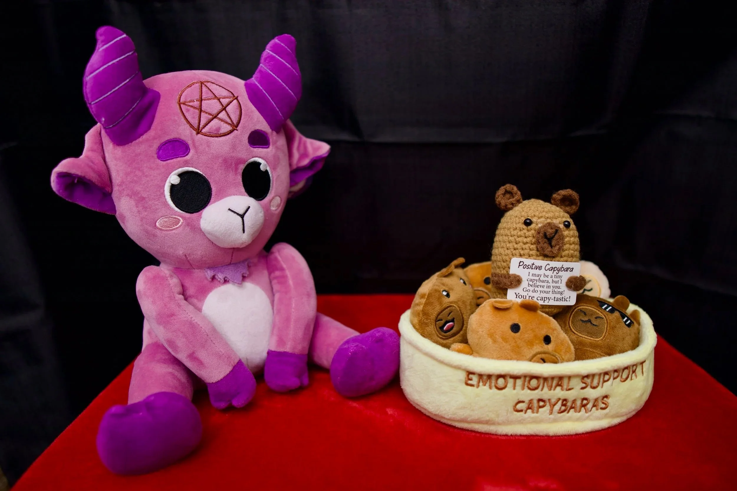 A Baphy plushie surrounded by his emotional support capybaras