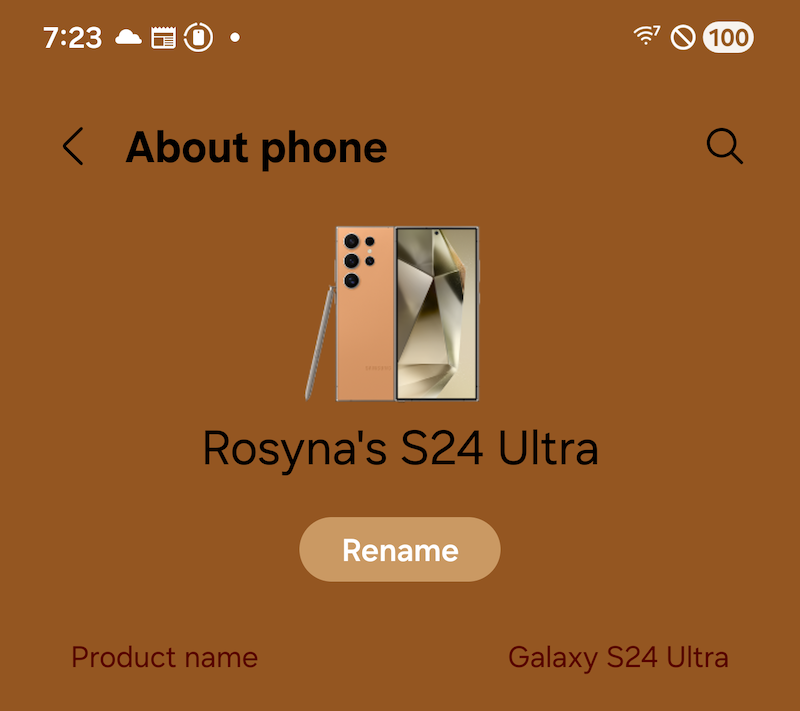 The device name is the user-assigned name of the device, like “Rosyna’s iPhone” or “Rosyna’s S24 Ultra.” Both Samsung and Apple devices automatically set their names during setup when you provide your account login details (Apple Account or Samsung Account, respectively). This highly disambiguates a device and is absolutely great for fingerprinting when combined with signals from other fingerprinting techniques. Many devices also automatically include your name in the default device name. Other devices, such as the Pixel, simply default to the product's marketing name, like “Pixel 8 Pro”.