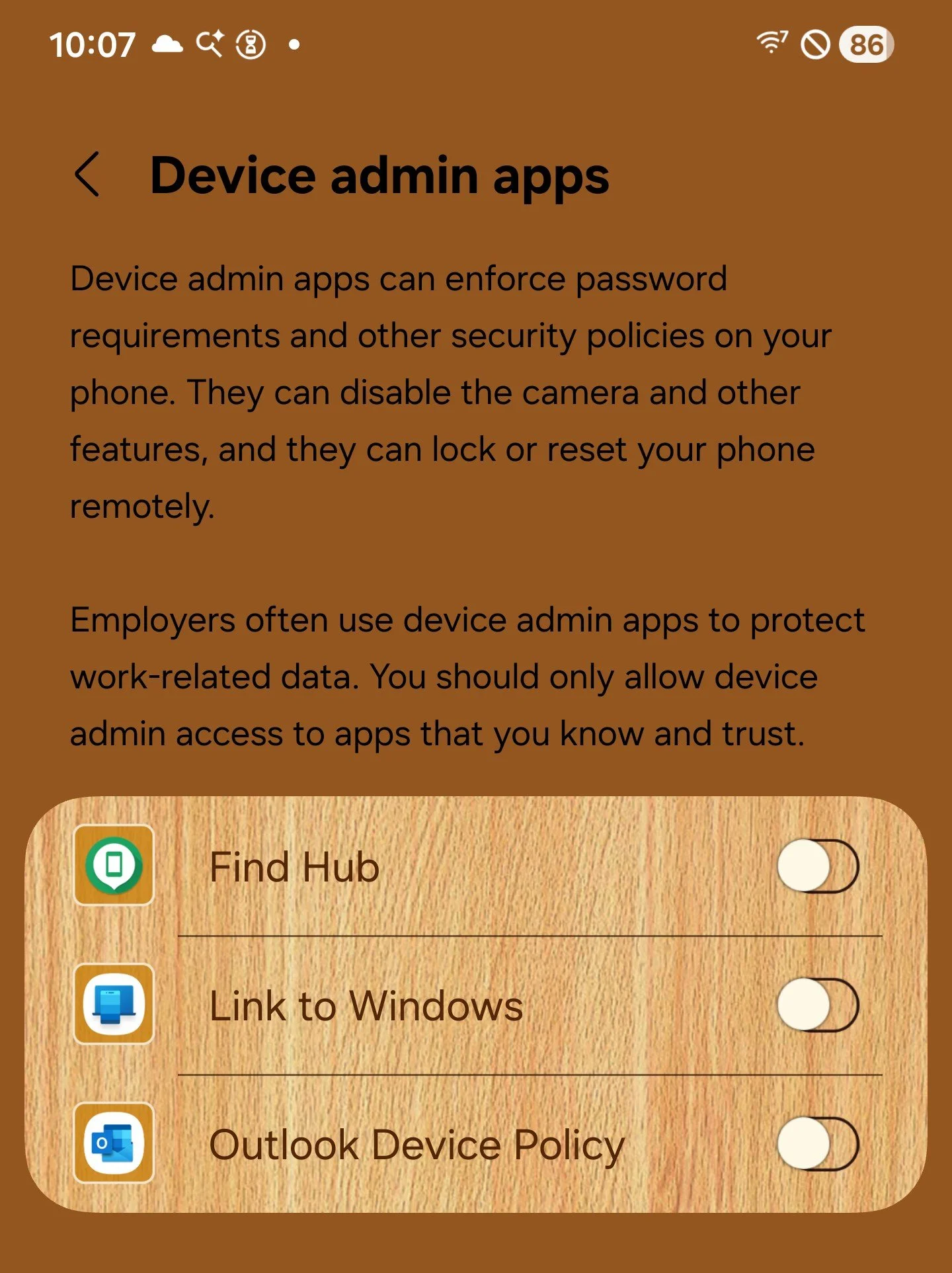 Here you’ll find flags to help fingerprint a user. getActiveAdmins() lets you retrieve the list of device administrator apps enabled on the device, as shown above.